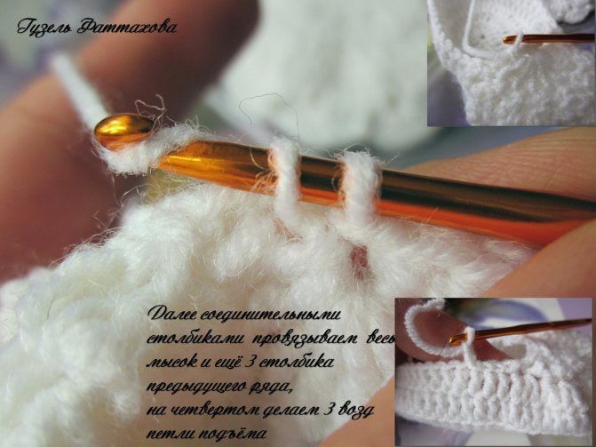 - След това примките на маншета, страничните и централните примки на пръстите се събират в кръг и се започва плетенето на ръба.