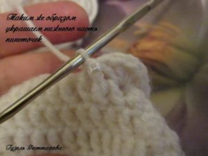 - Плетете подгъва, като го разделите на 2 зони и постепенно намалявате броя на бримките. Както вече беше написано, шевът на продукта в този случай трябва да бъде направен навън. Това ще предпази крачето на бебето от ненужно триене.