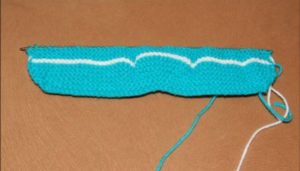- След това можете да изплетете маншета в кръг, без да отнемате бримки, или да завършите изделието, като завържете по ръба бримка рашета.