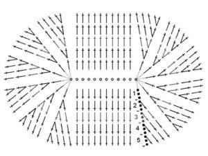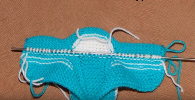 - След това се оставят отворени бримки в края на пазвата и се пришиват нови бримки отстрани по следния начин: 1 ред = 1 бримка.