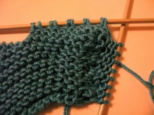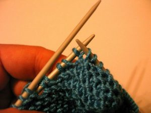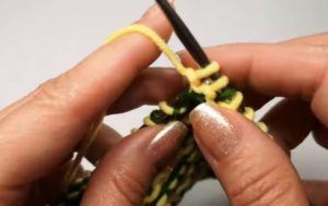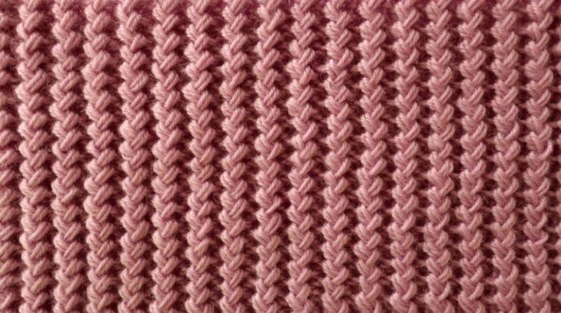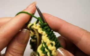 Зададеният ред е като обикновен ластик "1 върху 1" (редуване на прави и неправилни бримки).