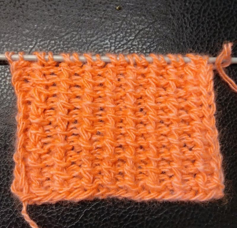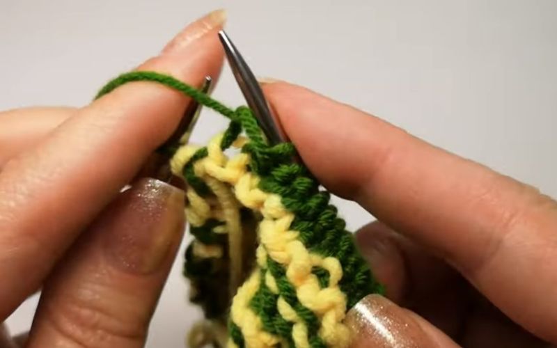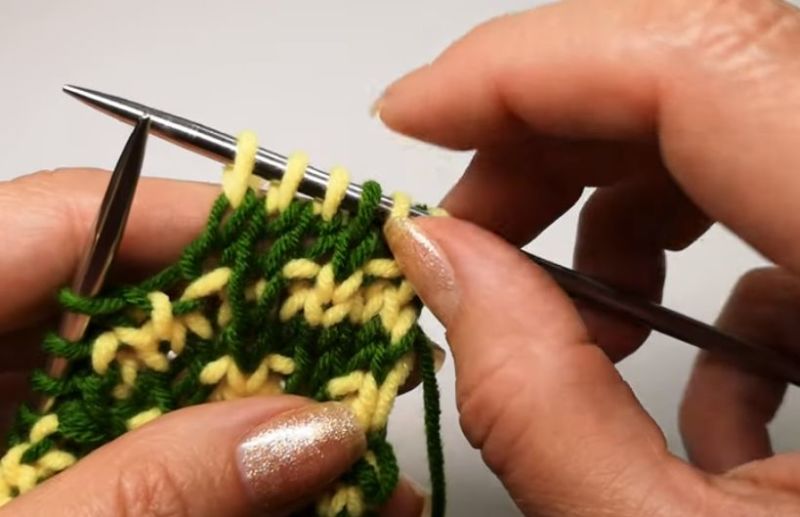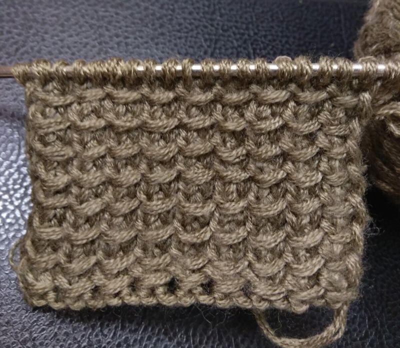 Редувайте 1×1 права и неправилна бримка, като неправилната страна следва модела. След това оризът се размества - грешната страна се пришива върху дясната и обратно до края на реда. Грешната страна е начинът, по който са положени бримките, след което моделът се променя отново, както в първия ред.