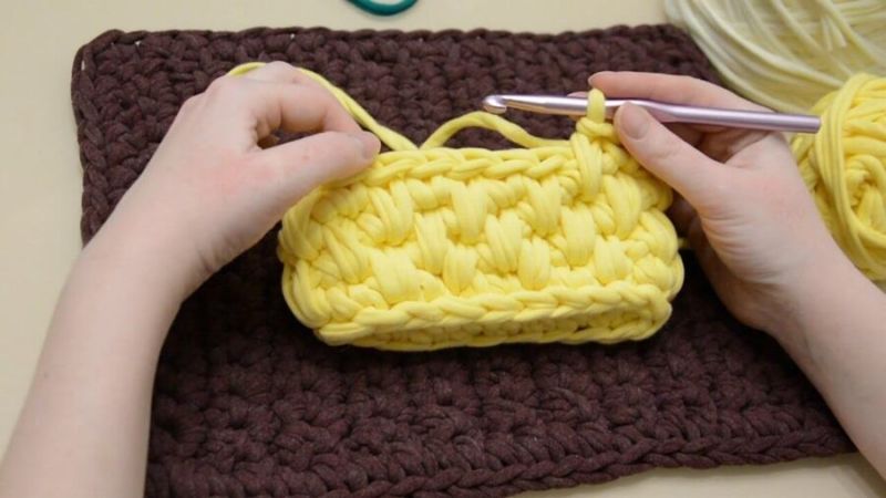 Тази обикновена плетка на една кука е добра отправна точка за плетене на аксесоари. Началният ред започва с ефирна бримка. След това куката за плетене на една кука се вкарва в V-образния възел и редът под нея е красиво изплетен.