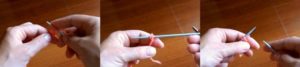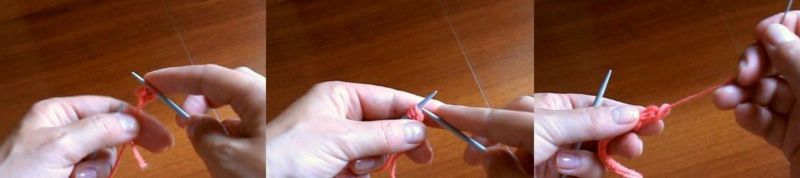 - На три. Този път подгответе игли за чорапи. Направете три леви копчета. Издърпайте ги заедно на края на една игла. Отново изплетете предните бримки, като преждата трябва да е отзад. Обърнете внимание, че при плетене работата не се обръща наобратно. С помощта на игла разхлабете конеца в края на шева и затегнете шевовете.
