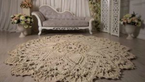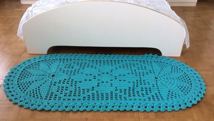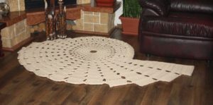 - Оплитане с помощта на мрежа. Този вид тъкане е няколко пъти по-трудно и по-трудоемко. Започнете с връзване на мрежа от въздушни примки. Всеки шев трябва да бъде обвит с шев с шев. Колкото повече са шевовете, толкова по-стегнат ще бъде килимът. Обърнете внимание, че ако плетете плътно, ще ви е необходима много по-малко корда. Можете също така да създадете шарки върху такъв килим, за което ще е необходима повече прежда.