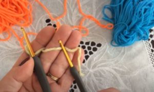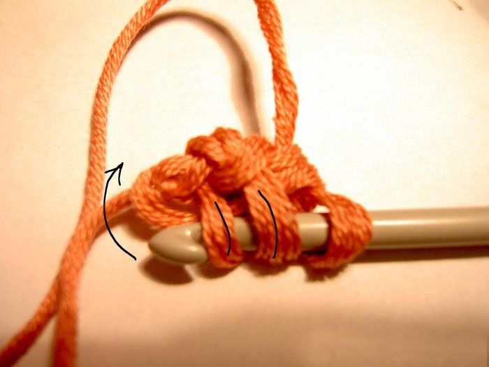 Направете същото и с втория. Ако сте направили всичко правилно, на куката трябва да се появят отново три бримки. Повторете всички операции от самото начало.