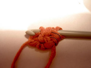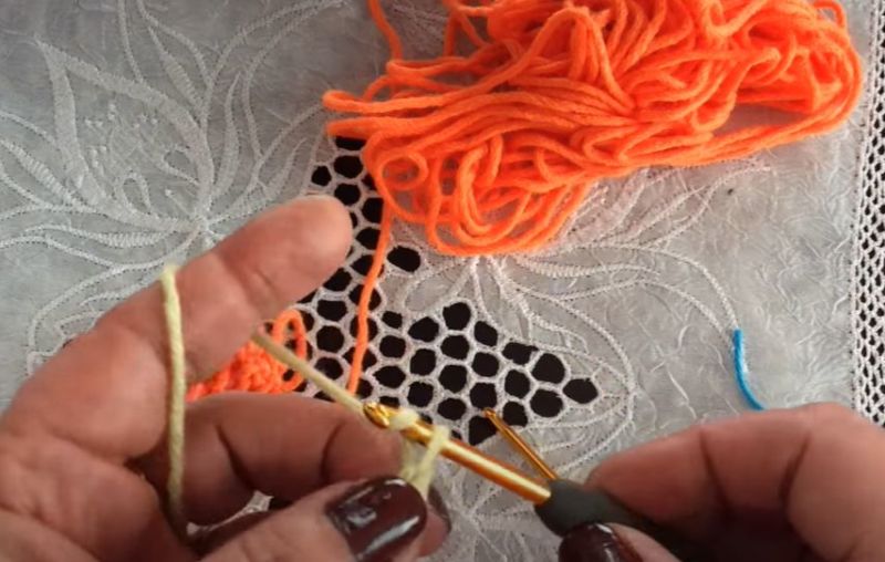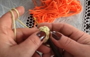 - Продължете с преждата от втория цвят. Издърпайте го през последния бод на куката.