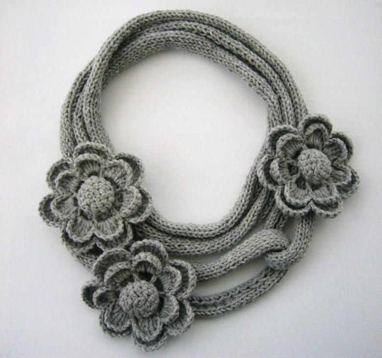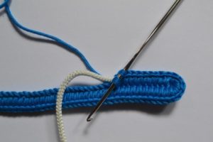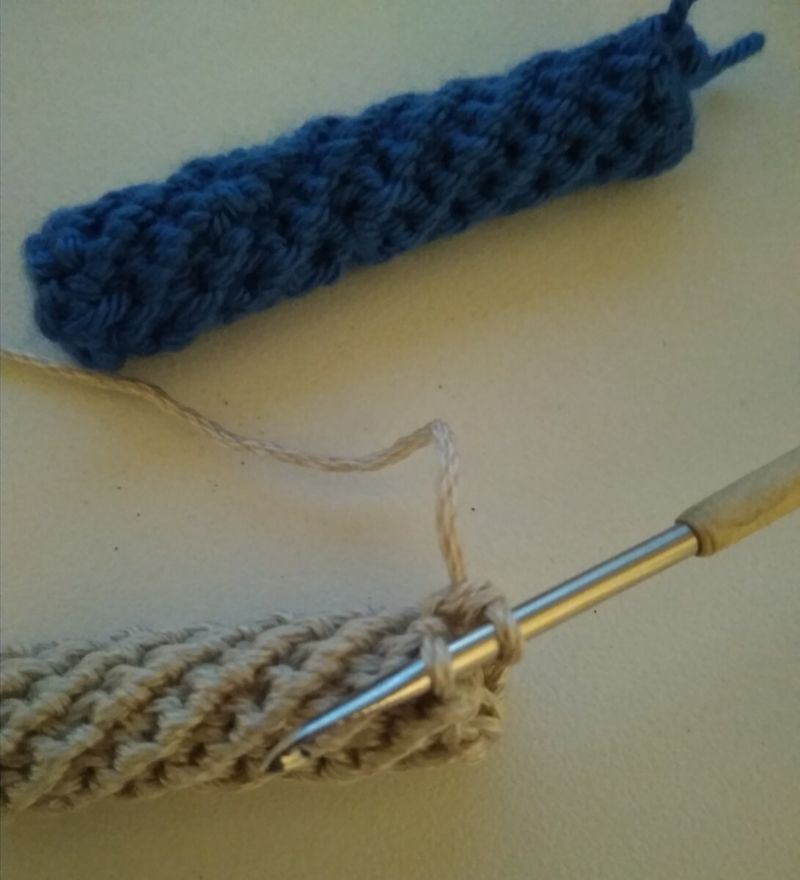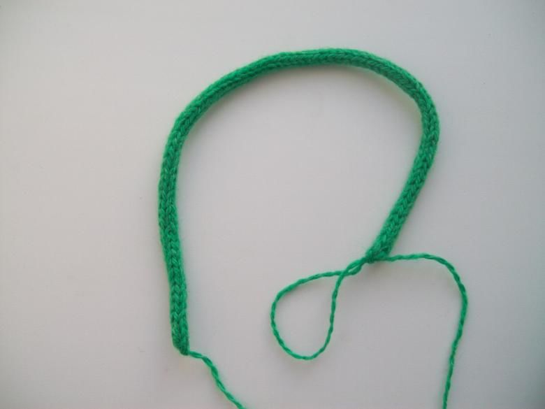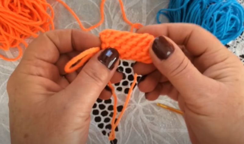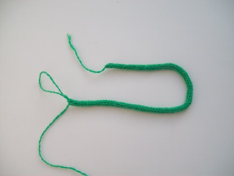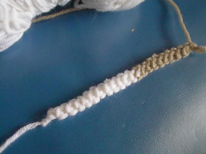 - Направете същото и за третия бод. Моделът е почти завършен, махнете две бримки от единия цвят и започнете с другия цвят. Изплетете необходимата дължина по този начин и я закопчайте. Готово!