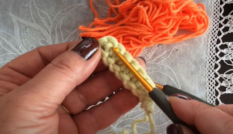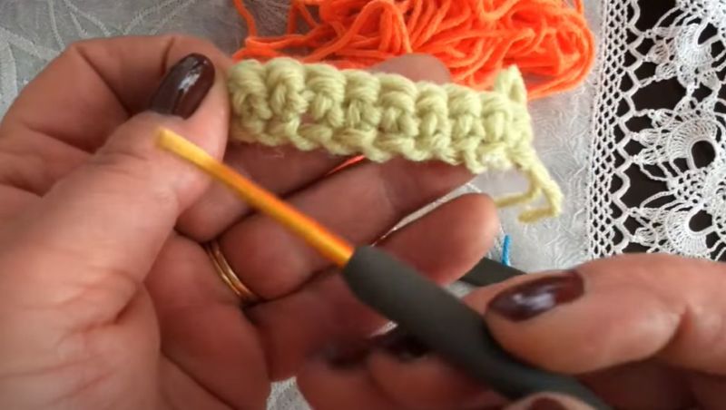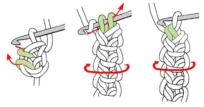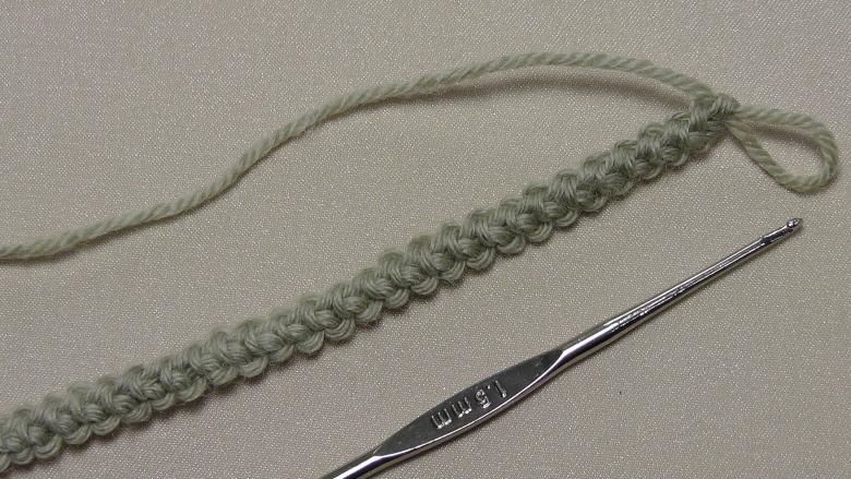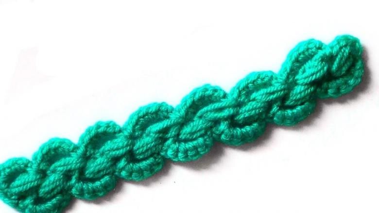 За да започнете, направете две въздушни примки. Към първата от тях завържете колона без връзки. Сега обърнете работата и повторете стъпките. Поставете куката от лявата страна под двата получени конеца. Схемата е завършена, повторете я до необходимата дължина и е готово!