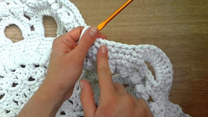 - По-дебел двоен шнур. Първата - три примки, към втората трябва да вържете колона без бод. Техниката се изпълнява, без да се обръща изделието. След това издърпайте преждата през най-лявата дупка и я съединете с останалите две примки. Вкарайте куката отново в най-лявата дупка и издърпайте преждата. Моделът е завършен.