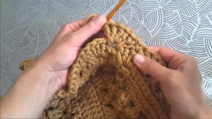 - Закачете работния конец и направете два бода без нито един бод. Направете това още четири пъти с по три бримки. Трябва да останат два бода. Поставете куката от противоположната страна и обърнете работата.