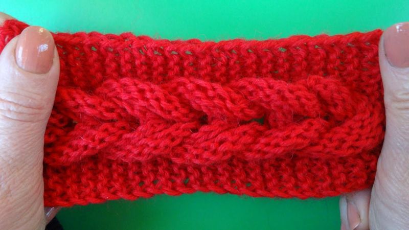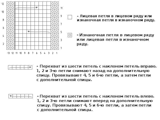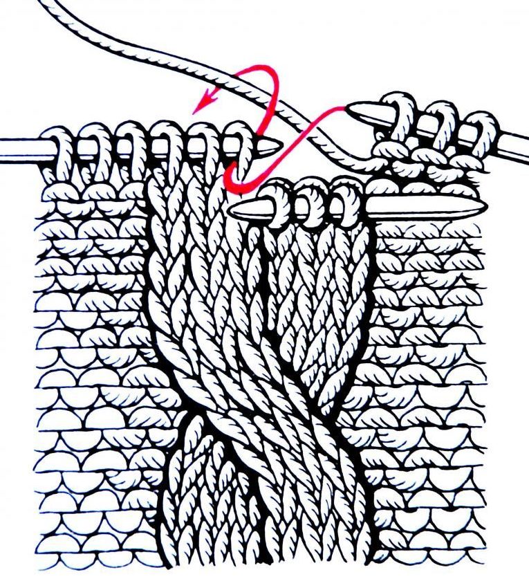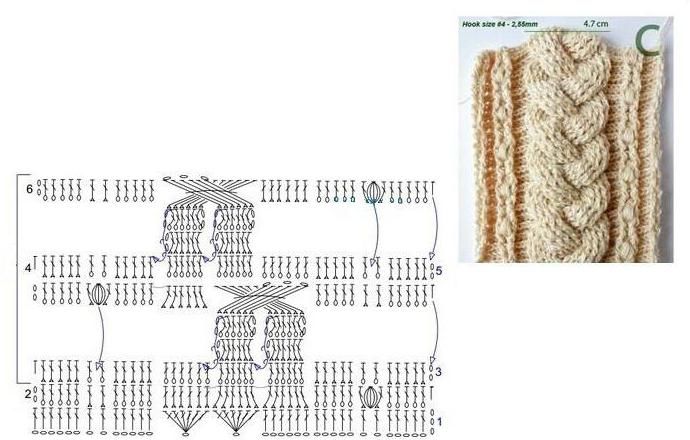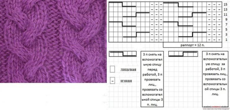 - Ред 5: Вземете 1 на грешната страна и 5 застъпвания. Кръстосването се извършва по следния начин: първо, оставяме първия бод на допълнителната игла, след това оставяме 3 бода на допълнителната игла в края на работата, плетем 1 ляв бод, след това плетем бодовете от втората допълнителна игла, след това от първата), след това 1 грешен и 5 десни бода.