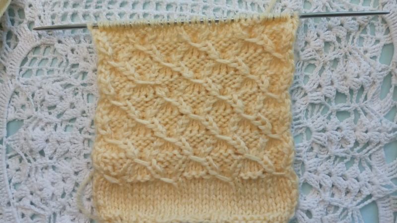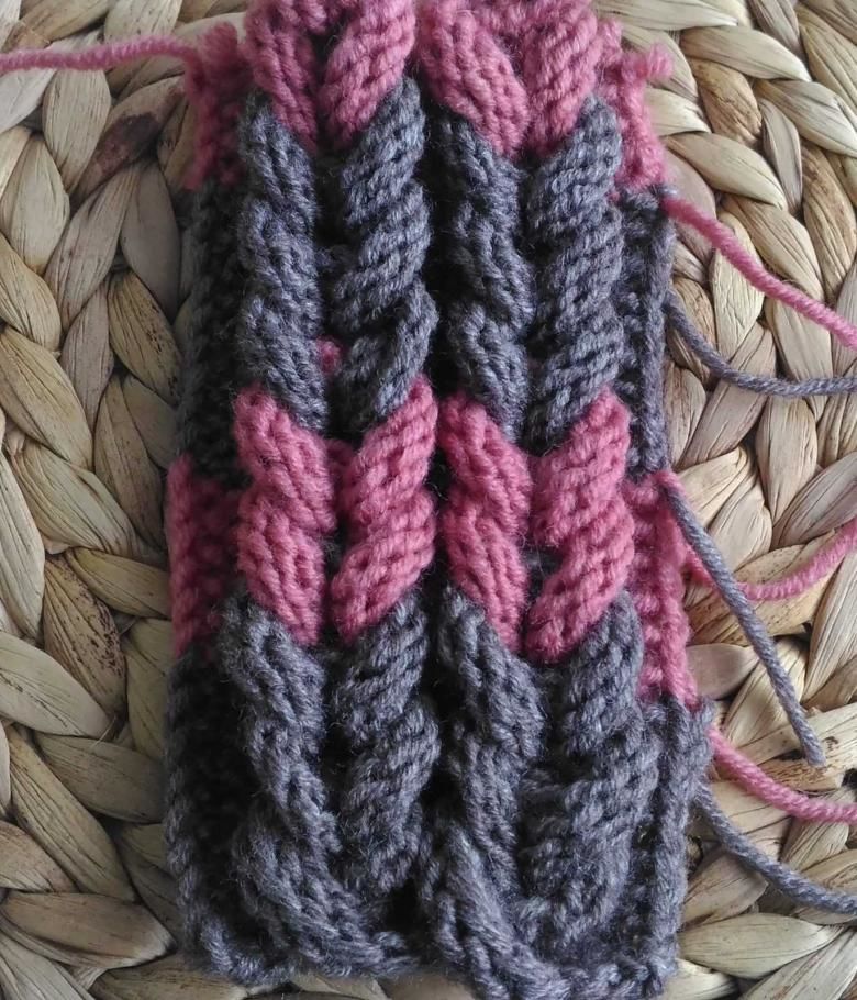 - Ред 7: Първите 2 са леви, след това 3 са леви, кръстосайте следващите 6 бримки надясно и завършете с 3 леви и 2 десни бримки.