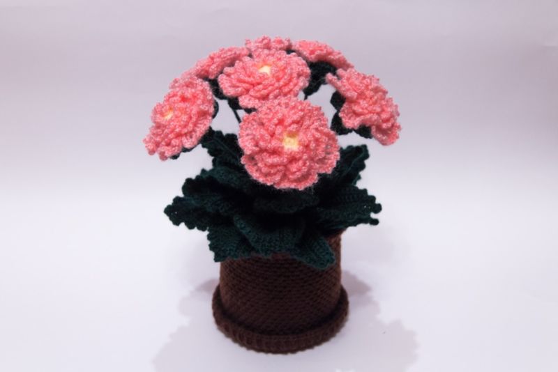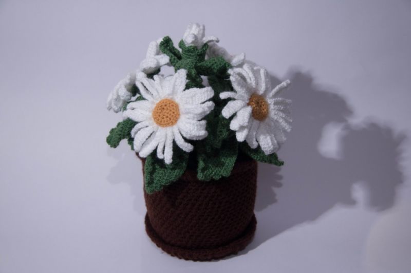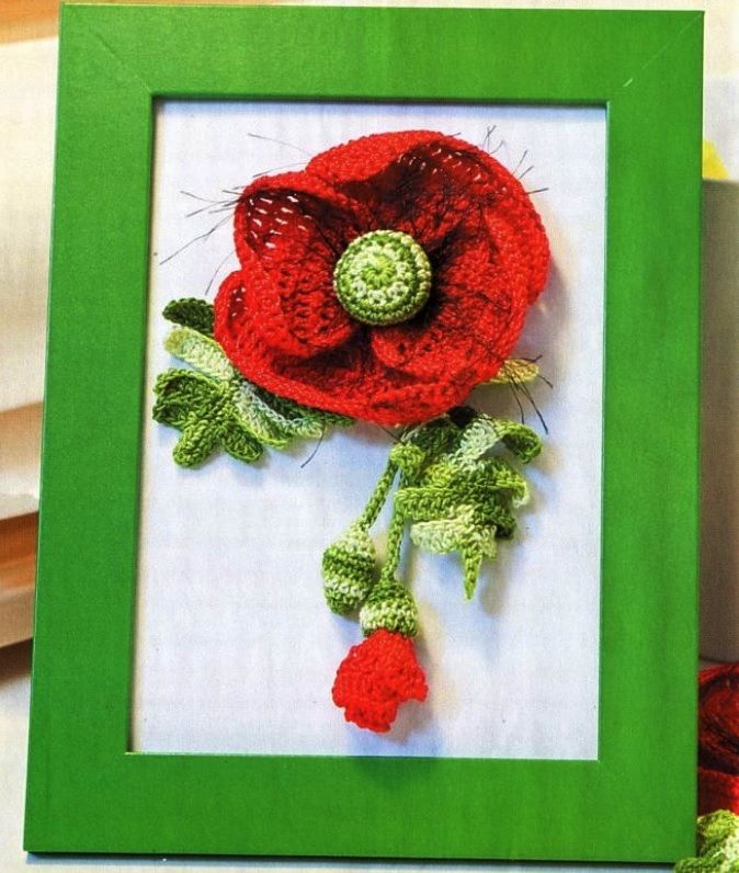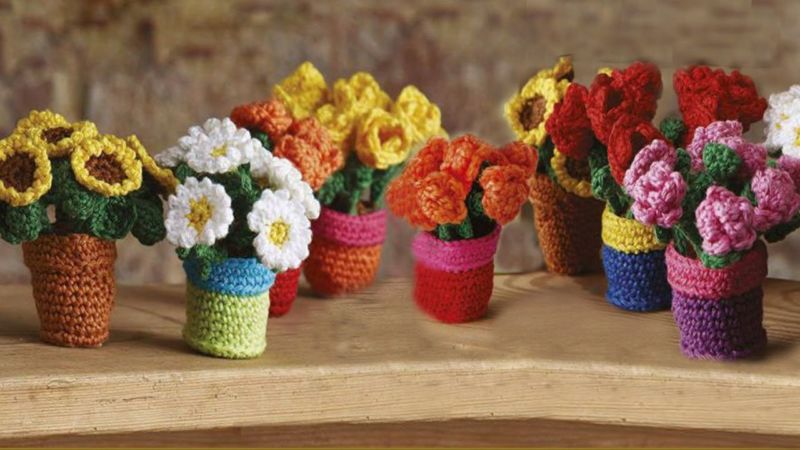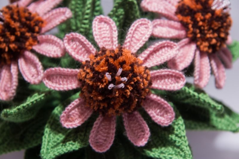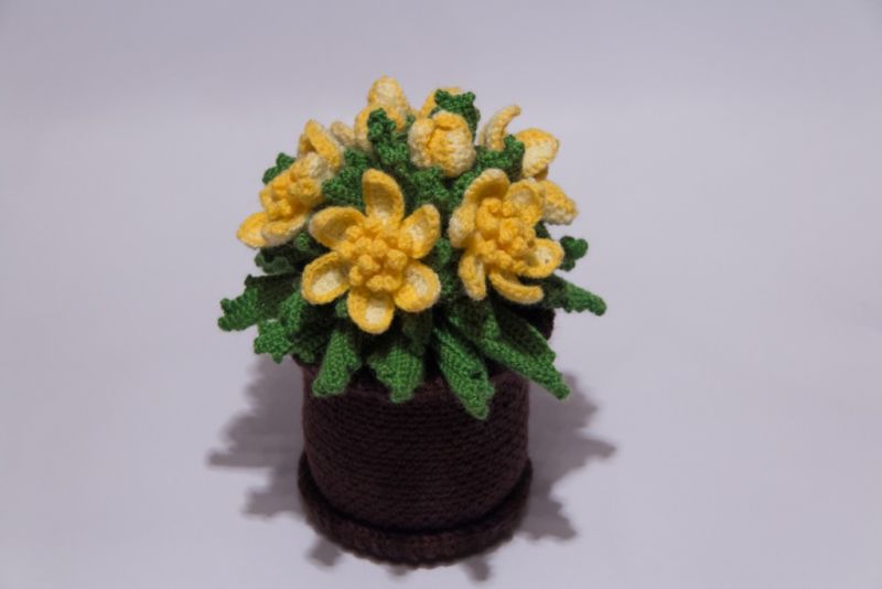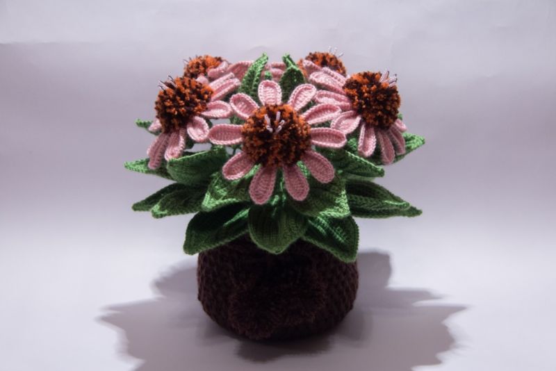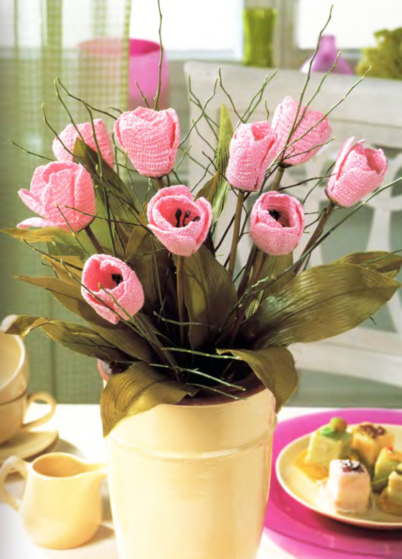 Ако изплетете пъпките от конец и ги прикрепите към доста плътни телени рамки, можете да създадете цяла композиция. Няколко от тези цветя могат да се поставят в керамична саксия и да украсят стаята.