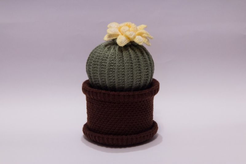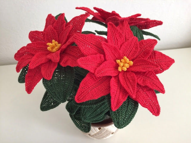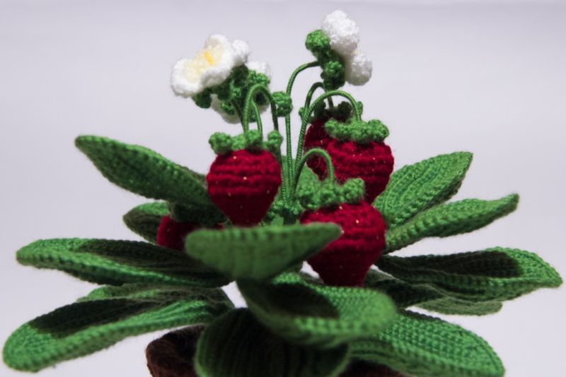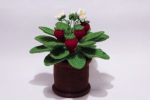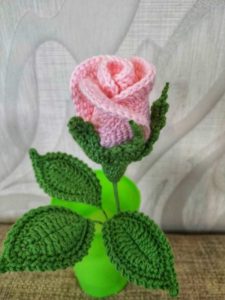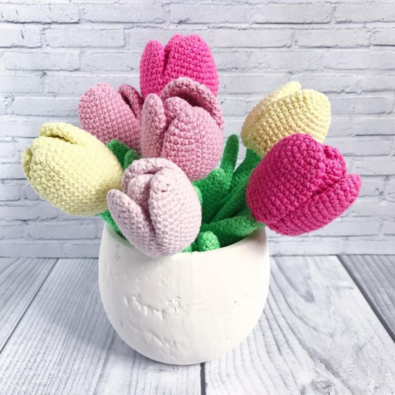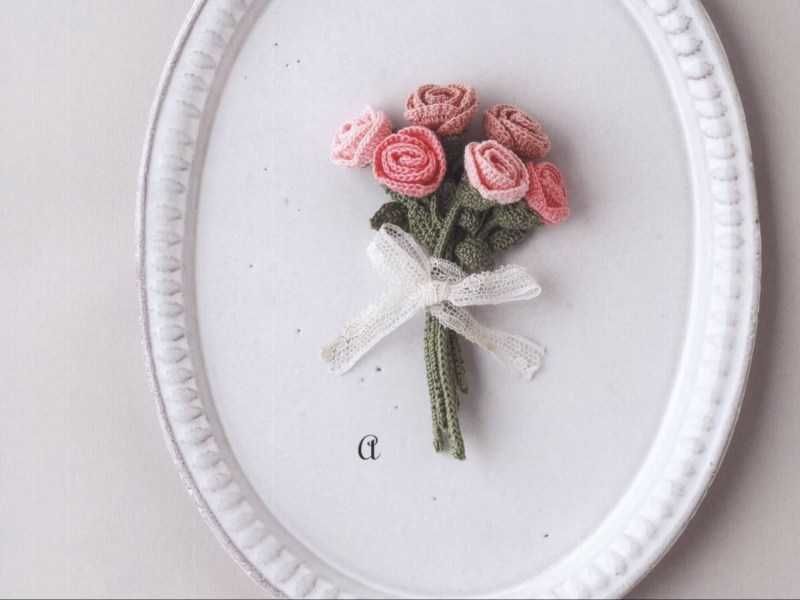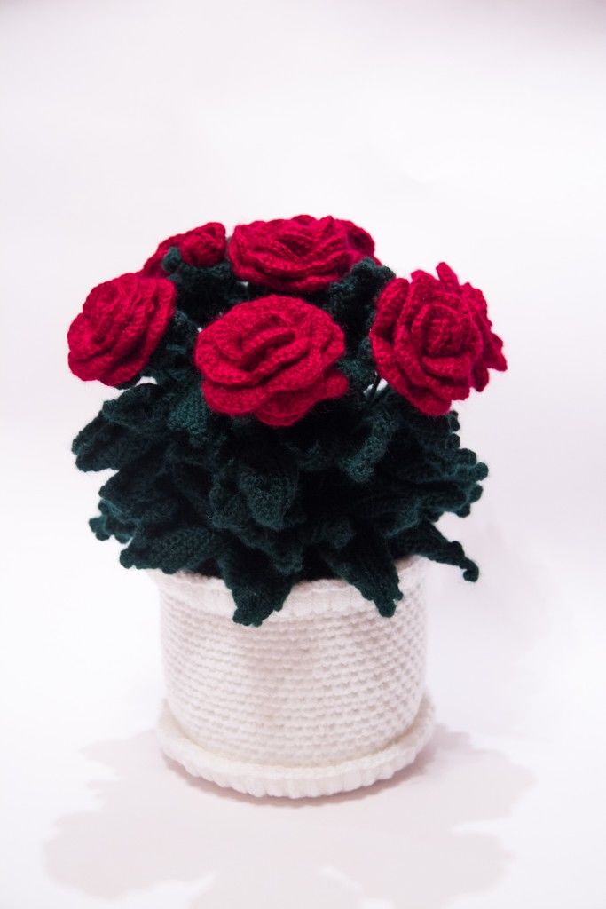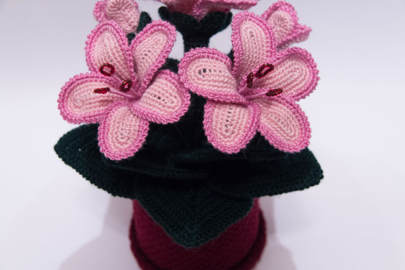 Ако изплетете пъпките от конец и ги прикрепите към доста плътни телени рамки, можете да създадете цяла композиция. Няколко от тези цветя могат да се поставят в керамична саксия и да украсят стаята.