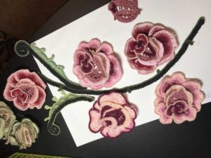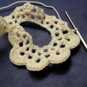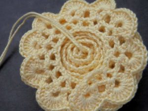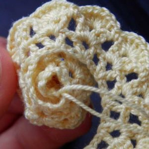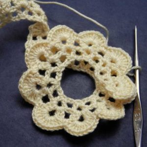 - Съберете шевовете върху конеца и ги заплетете, за да образувате разпръснат волан, разделен на съответния брой венчелистчета. Направете тънък шнур от въздушни примки, оформете го на спирала, поставете го в центъра на цветето и го закрепете с игла и конец.