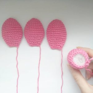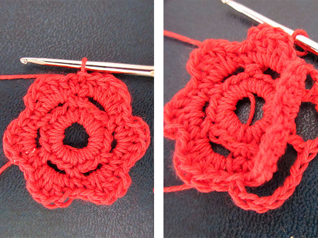 - Завържете всеки от 4-те елемента, за да образувате венчелистче. Изберете 1 balloon st от кръстовището. В следващата дупчица - око с 1 п. - повторете 2 пъти. Завършете с б/н в края на реда. Повторете това от двете страни за общо 8 бримки.