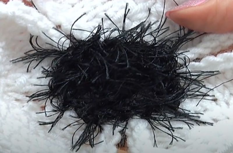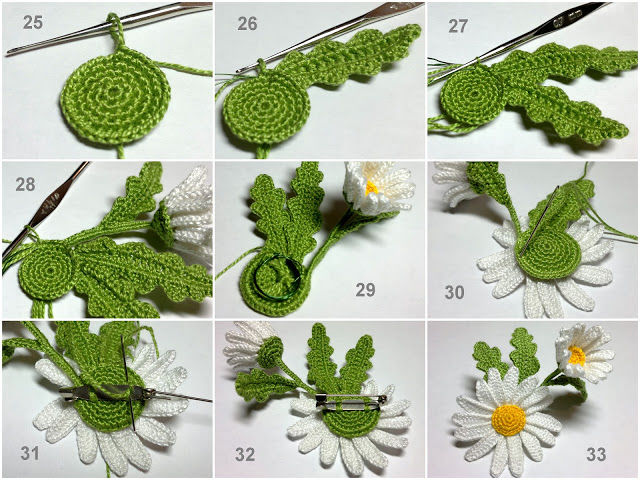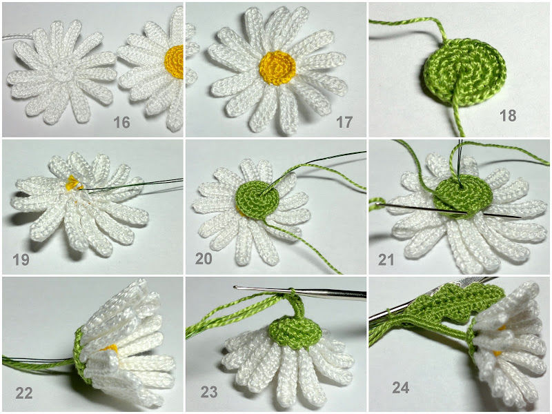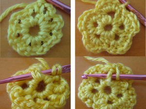 Обърнете внимание, че централната част се плете на една кука с жълт конец, а когато кръгът е напълно завършен, преминете към бял конец.