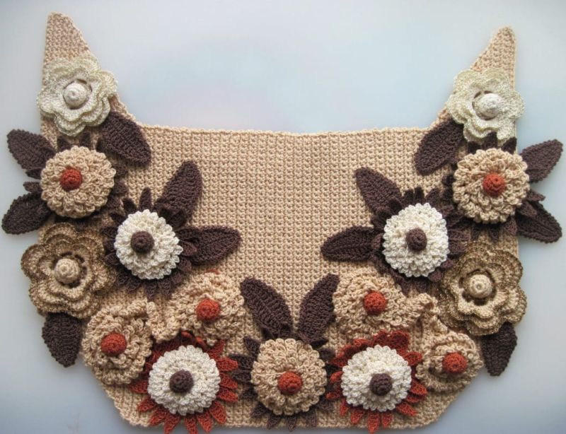 - Вторият вариант е плетен продукт от една част, за предпочитане едноцветен, който впоследствие се допълва с флорални мотиви. Те са зашити отделно и образуват своеобразен панел.
