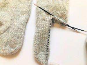 Необходима е ластична лента, за да се задържат гетите на краката ви. Освен това това е любим метод за плетене на всички начинаещи. Това е просто: редувайте предните и задните бримки в съотношение 1*1 или 2*2. В горната и долната част на чорапа съветвам да плетете с игла с един размер по-малка, за да се получи плътна материя.