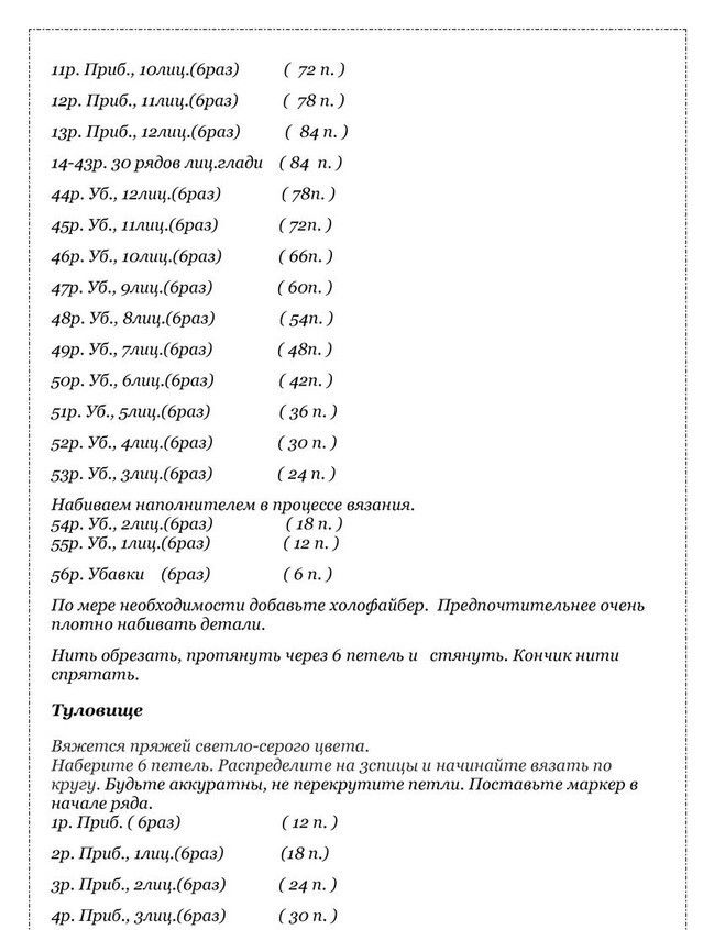 - Плетено туловище и лапи. Започваме от шията с 36 бримки от бяла прежда. Плетете в кръг върху предните бримки. След 35 реда разделяме бримките на 2 части. Към тези бримки ще прибавим 2 допълнителни бримки. Общо 20 бримки - това са крачета. Пригответе 19 бримки в бяло и 8 бримки в розово. Разтегнете шевовете.