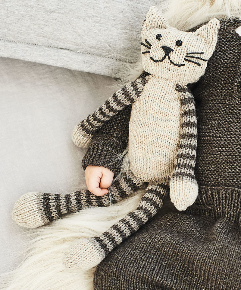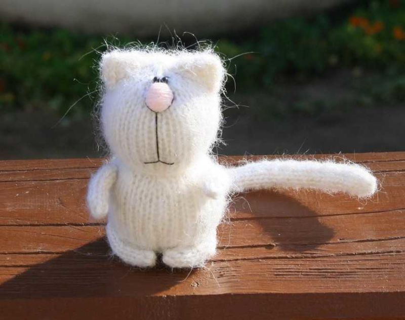 Използва се плетене на шал. Два еднакви квадрата се зашиват и се пълнят със синтетични влакна. На мястото на квадрата в ъглите, където се намират ушите на котката, прокарайте иглата и стегнете триъгълниците.