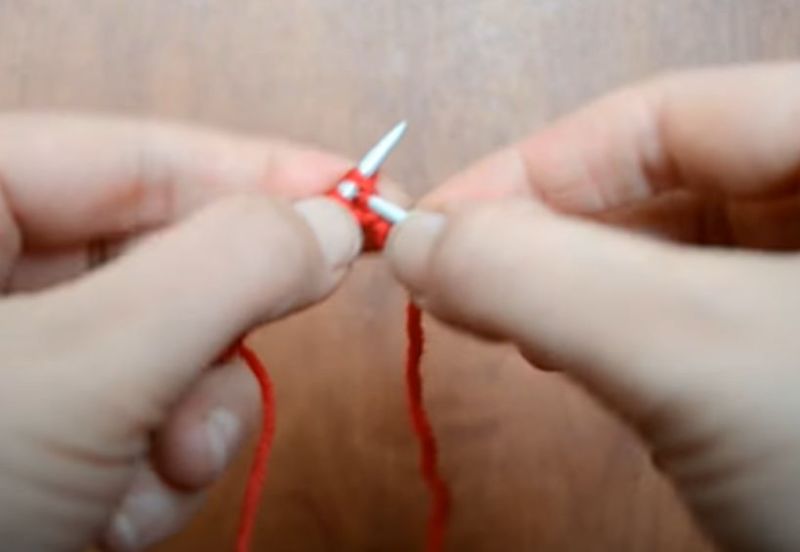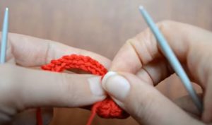 - Вземете 36 бримки и ги разпределете върху 4 спици. Изплетете тридесет бримки в кръгова фигура. Изплетете главата с първата и третата бримка, като съберете две бримки. Краят ще бъде като чифт ръкавици.