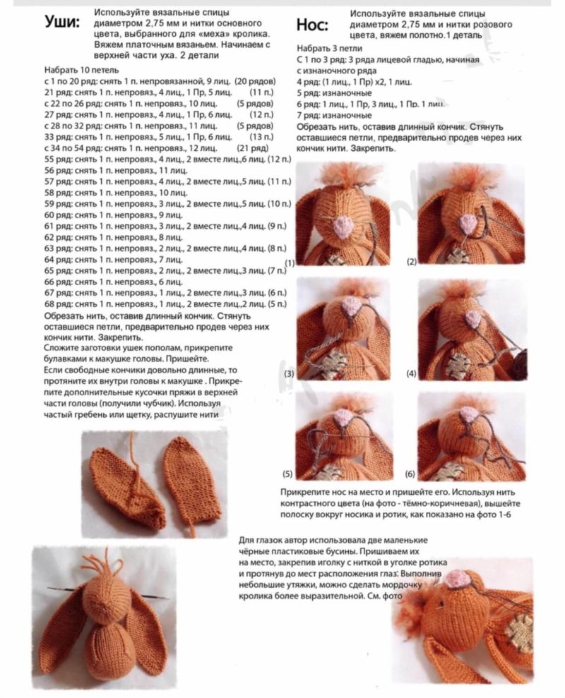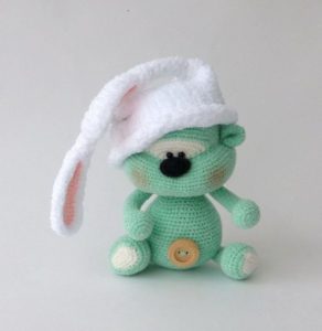 Такава играчка се плете подобно на заека. Но с различно лице и уши. Ушите се изработват на 16 бримки и едноцветна прежда в цвета на цялото мече. Във всеки втори ред от двете страни добавяме по 1 бримка.