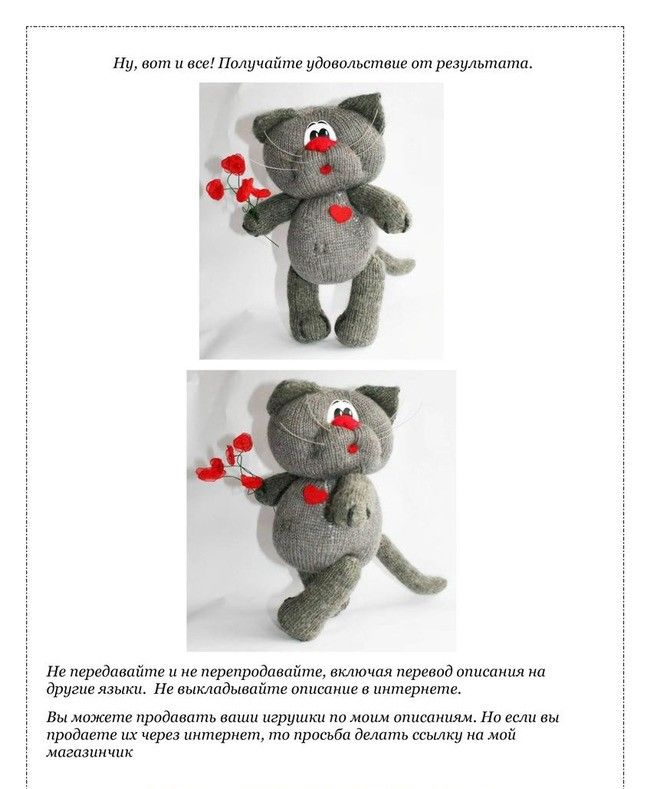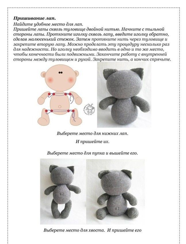 Горните лапи се плетат по същия начин и се пришиват към страните на квадрата. Зад опашката е зашита опашка, която може да бъде направена под формата на косички, които са плетени на една кука.