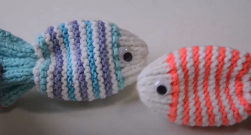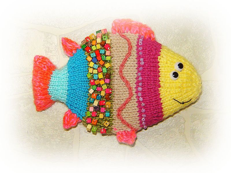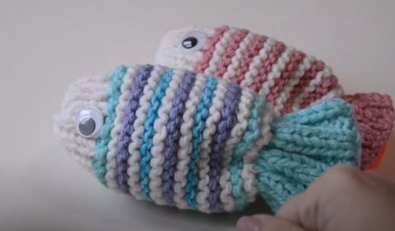 - Когато ни остане един бод на спиците, завържете ги на конец. Напълнете рибата със синтетични влакна. Зашийте гърба на плата.