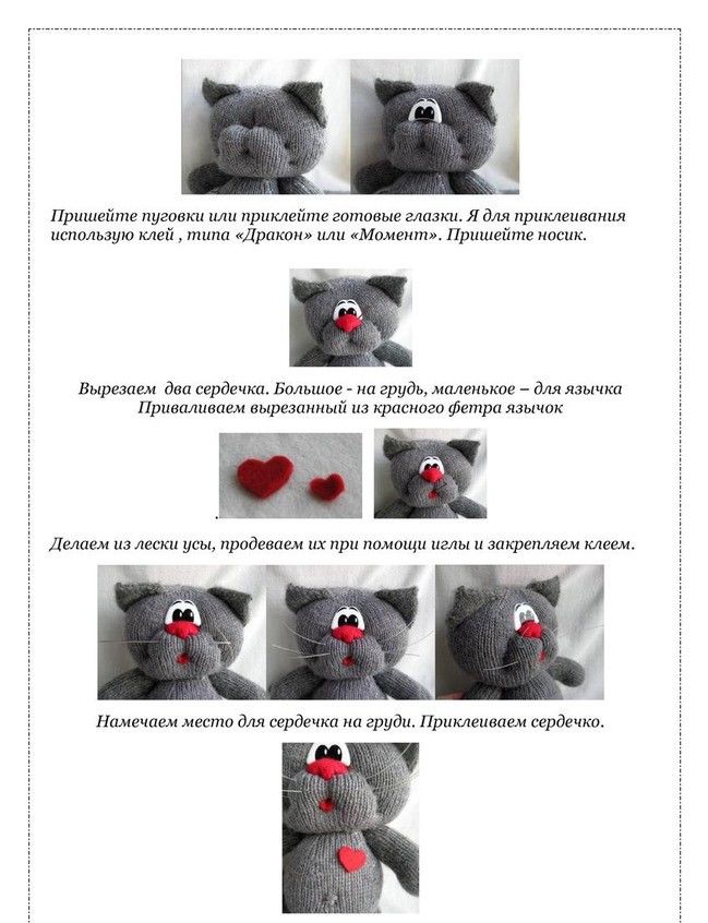 Очите, носът и устата могат да се бродират с конец. Към долната част на квадрата пришийте лапички, които се плетат от 20 бримки шалте. Те също се пълнят с плънка, но не плътно.