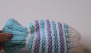 - Направете три шева, за да създадете перки. Плетете с трикотажна плетка, като прибавяте по една бримка към всеки край на финала.