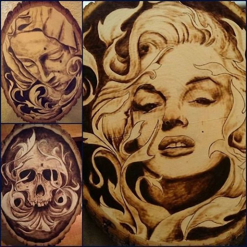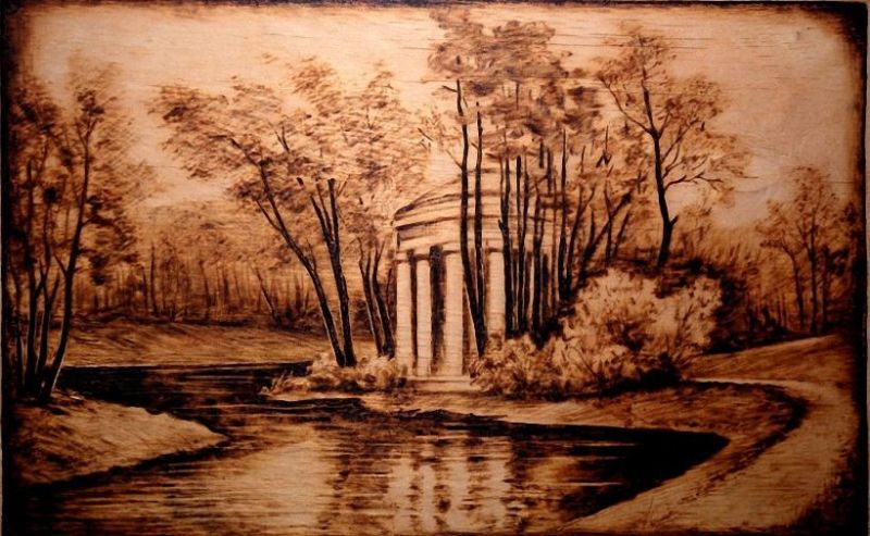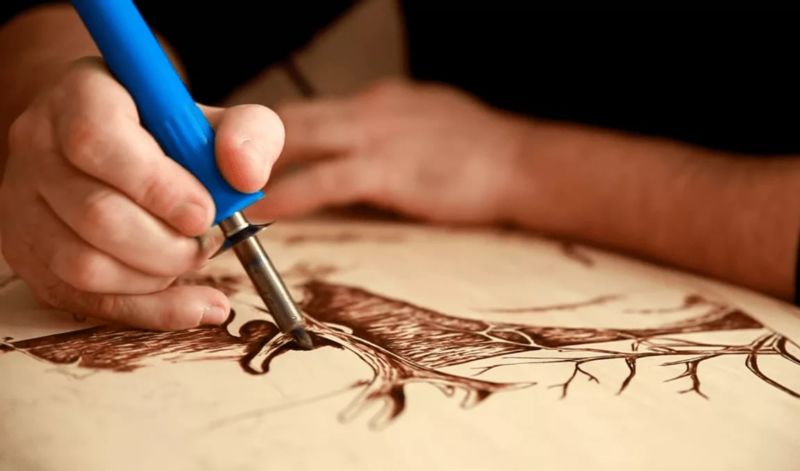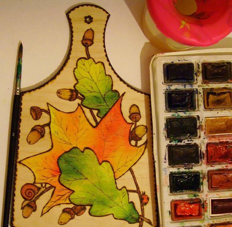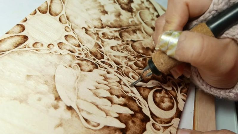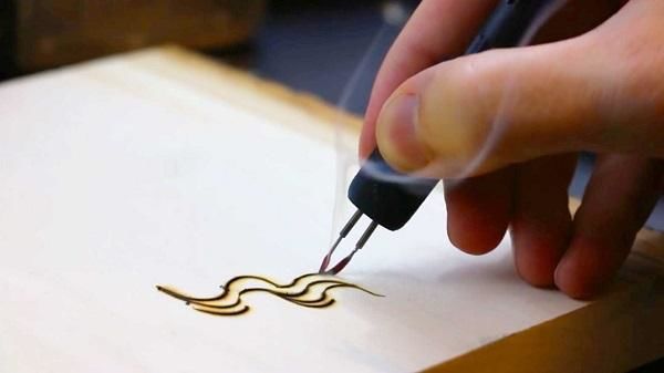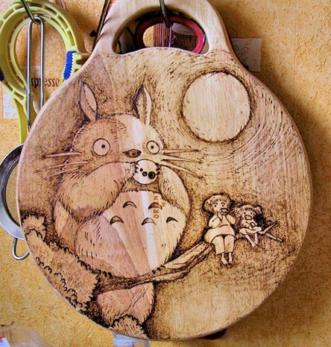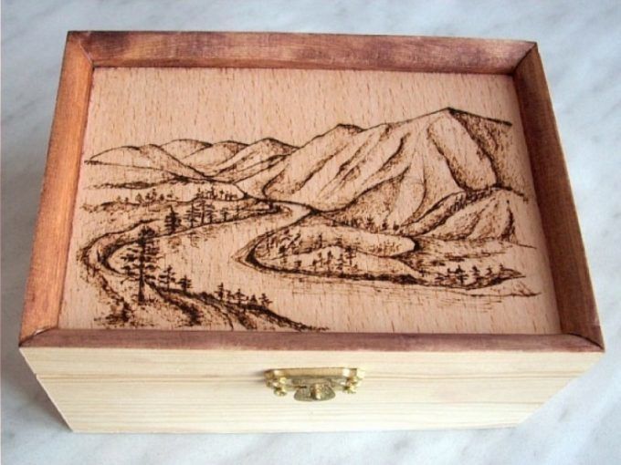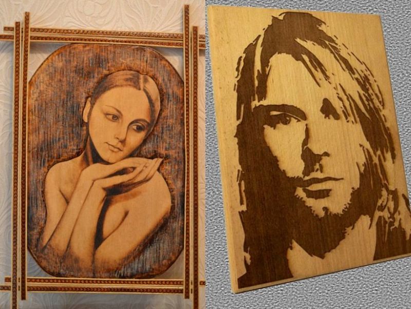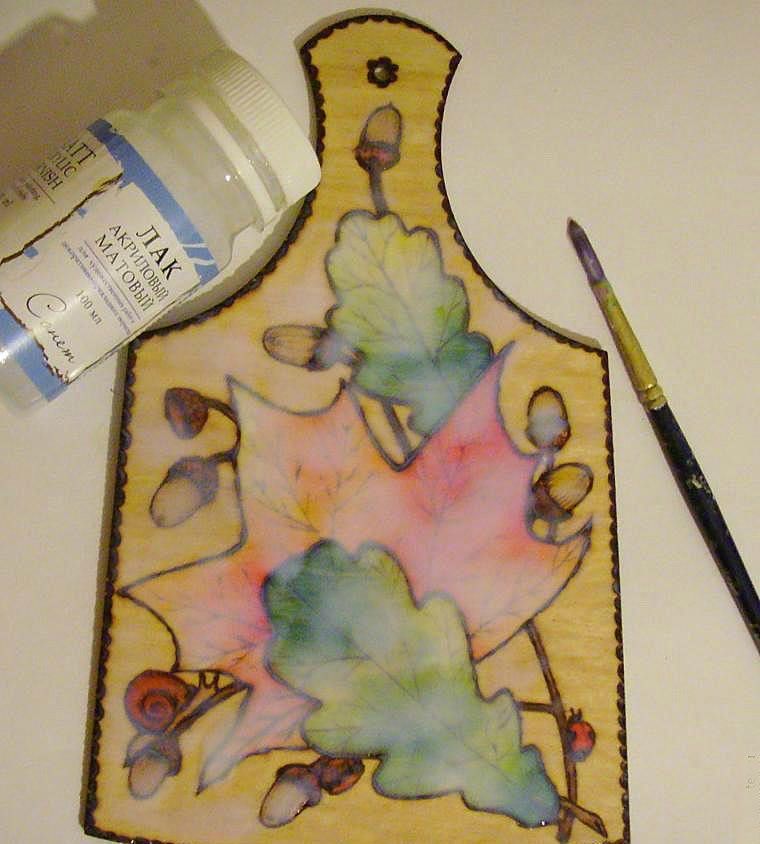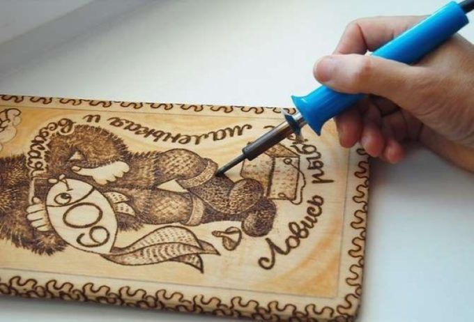 Изгарянето на моделите прилича на релаксация. Работата е фина, старателна, изискваща усърдие и бавност. Можете да декорирате дървени съдове, дъски за рязане, пана, рамки за огледало и снимка, вратички на шкафове, парапети и други части от мебели.