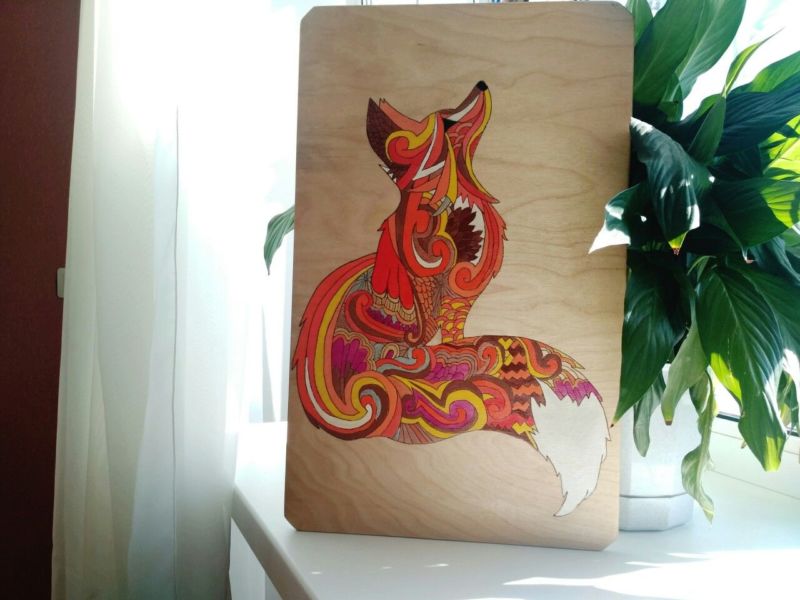 Рисунката, особено ако е натюрморт или изображения на животни и анимационни герои, може да се оцвети с боя. За тази цел са подходящи матови бои като гваш, темпера и акрилни бои, които напълно покриват цвета на дървото, или акварелни бои, които създават лек полупрозрачен ефект.
