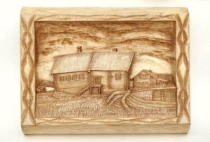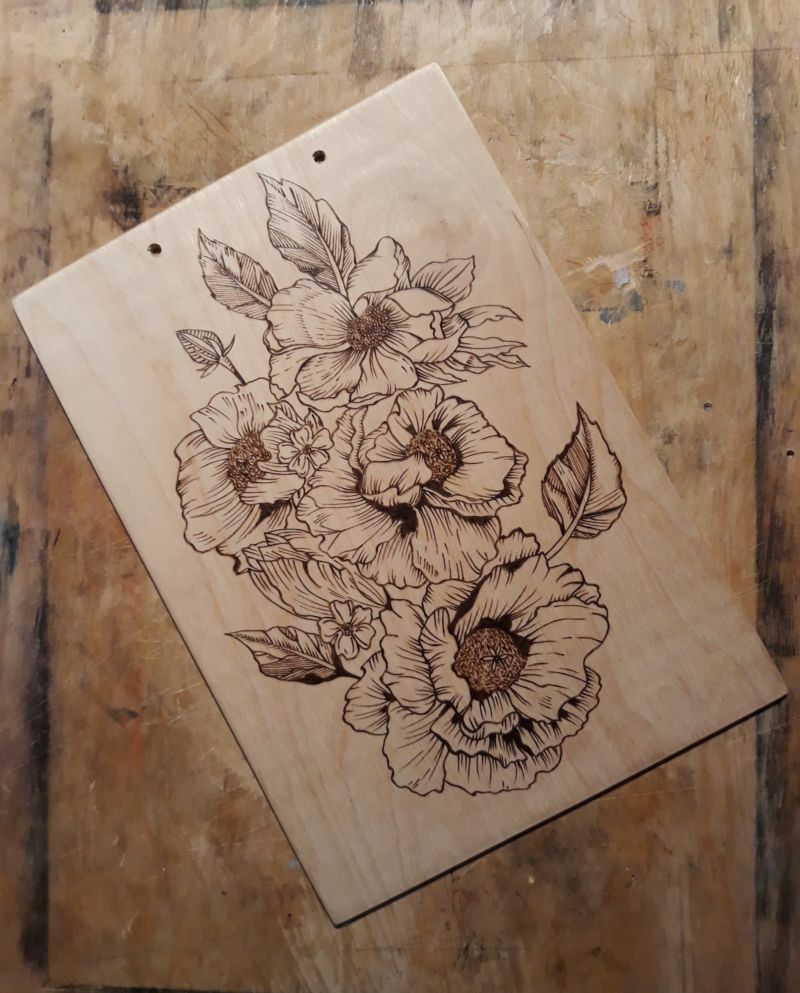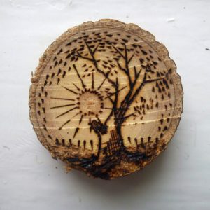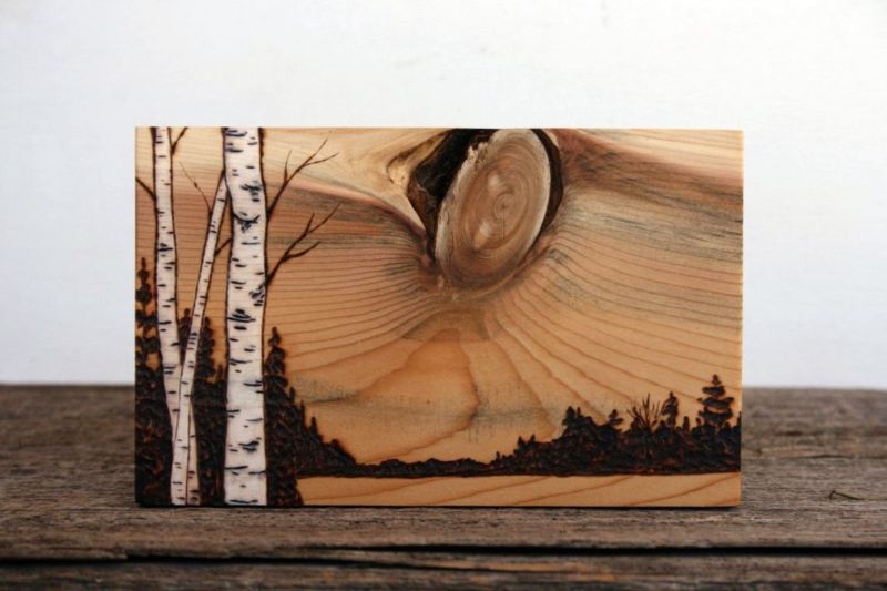 - Подготовка на дървената основа, която се състои в изрязване на подходящия размер и шлифоване с шкурка. И двете повърхности и ръбове трябва да се шлифоват. Важно е да се използва само чиста, изсушена иглолистна дървесина, като топола, елша и липа. Дървесината на тези видове се запалва при по-ниски температури от тази на брезата, мека е и затова се обработва лесно.