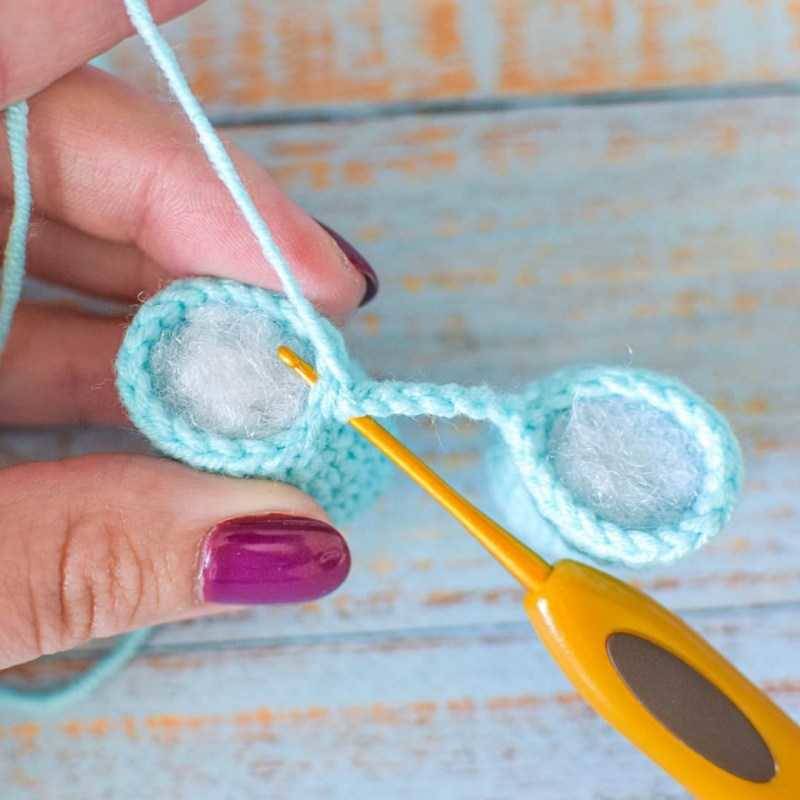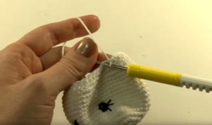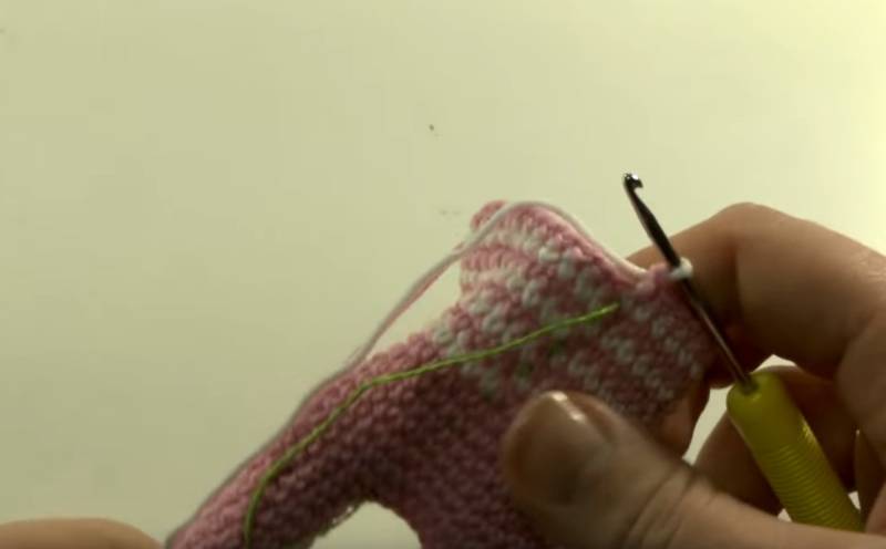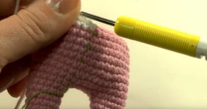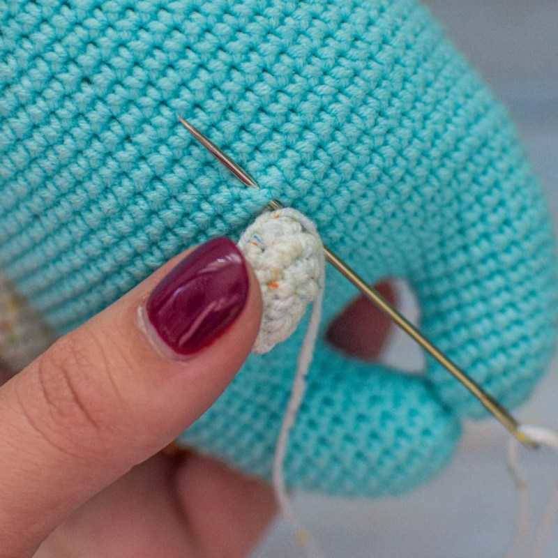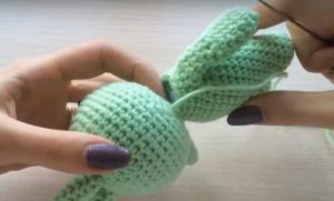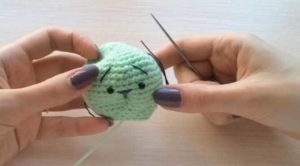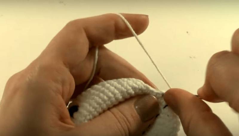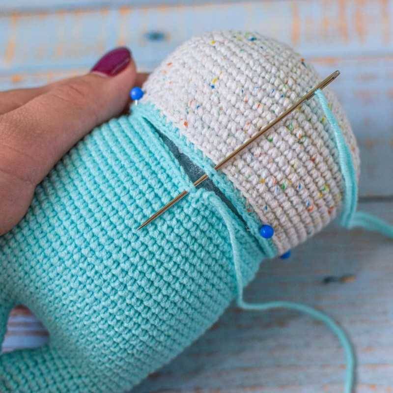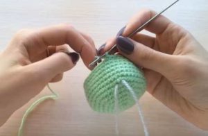 - След това всички части, затворени със съединителни шевове и напълнени с пълнеж, могат да се зашият с конци в същия цвят като преждата за плетене.