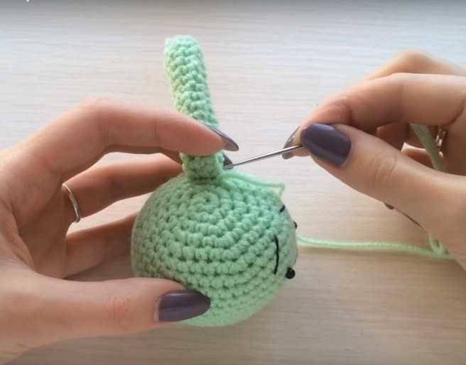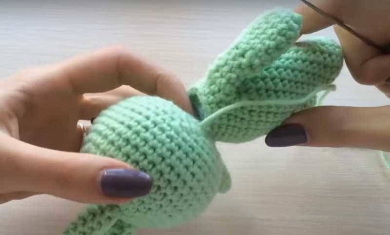 Второто ухо се плете по същия начин, след което се пълни с пълнеж и се пришива към готовата глава.