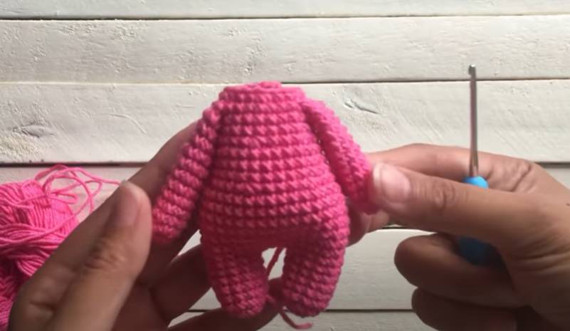 Плетенето на основната част на заека напомня реда на работа върху главата, но средата на изделието трябва да е по-издължена, така че средната част, която не добавяме и не добавяме примки, продължава с 10-та до 18-та.