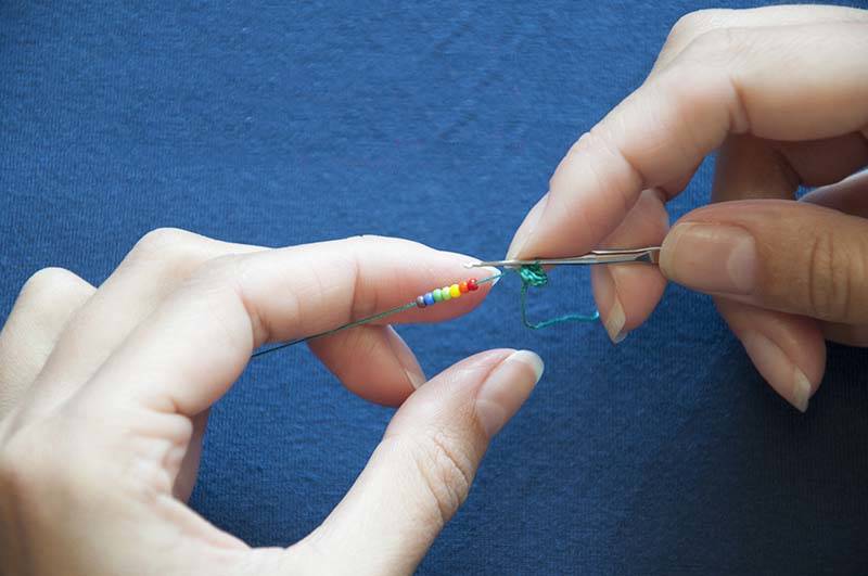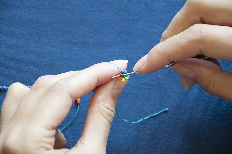 - Закрепете конец в края на въжето. Нанижете мънистата върху него. Колкото по-малко мъниста могат да бъдат нанизани и пришити едновременно, толкова по-добро е качеството на дизайна.