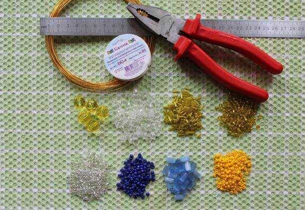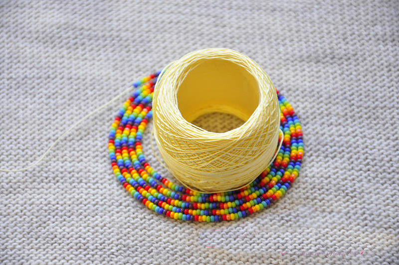 Подгответе черни и жълти мъниста (възможни са и други цветове), конец, игла, кука 1, ножица, щипка за хартия.