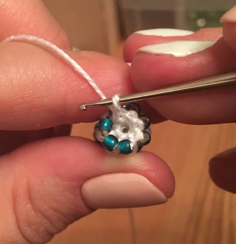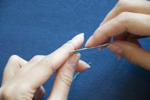 - Нанижете 1 мънисто на иглата. Прекарайте го през второто парче от пръстена, като пропуснете първото.
