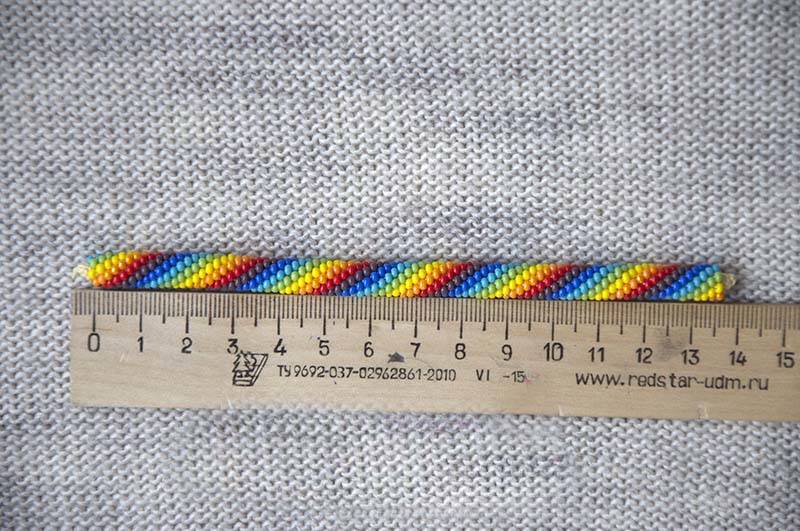 Изчислете дължината на работната нишка. Плитката е дълга 10 см, а броят на мънистата в пръстена е 7 броя. Диаметърът на пръстена от 7 мъниста е 1 cm.