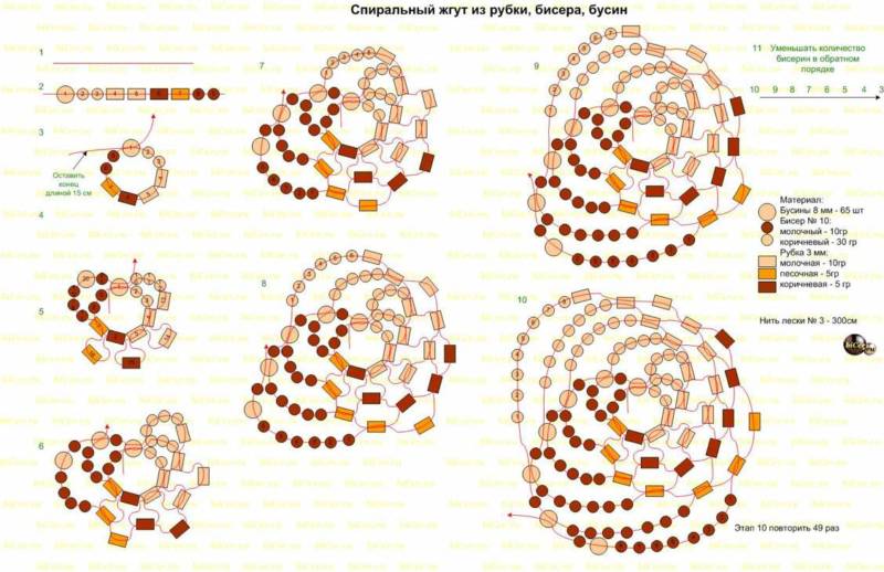 - Следвайте тази схема, докато гривната достигне желаната дължина. Създайте красива двуцветна спирала.