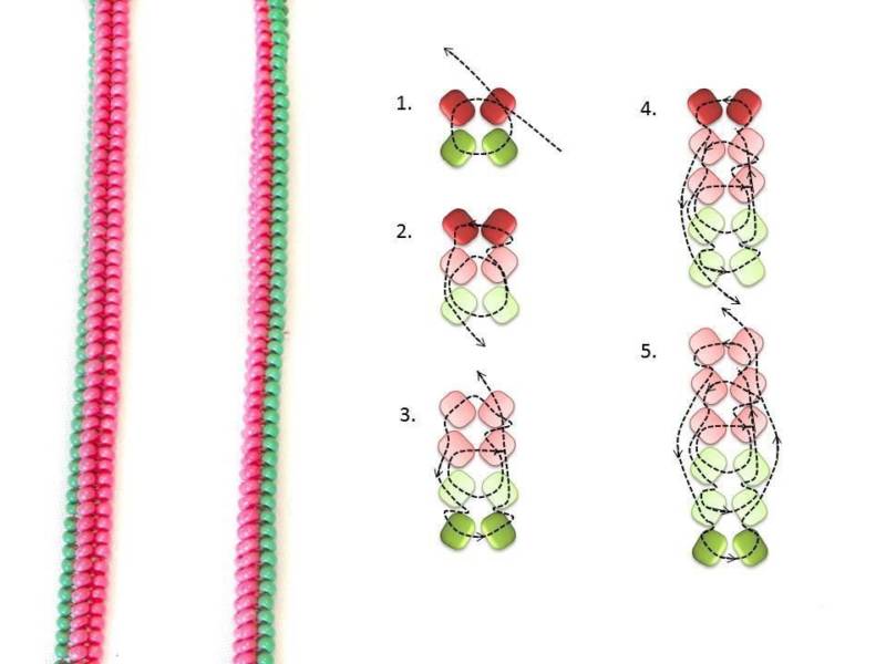 При плетене на колони мънистата се поставят по диагонал, а при плетене на полуколони - по хоризонтал. Това прави модела да изглежда различен.