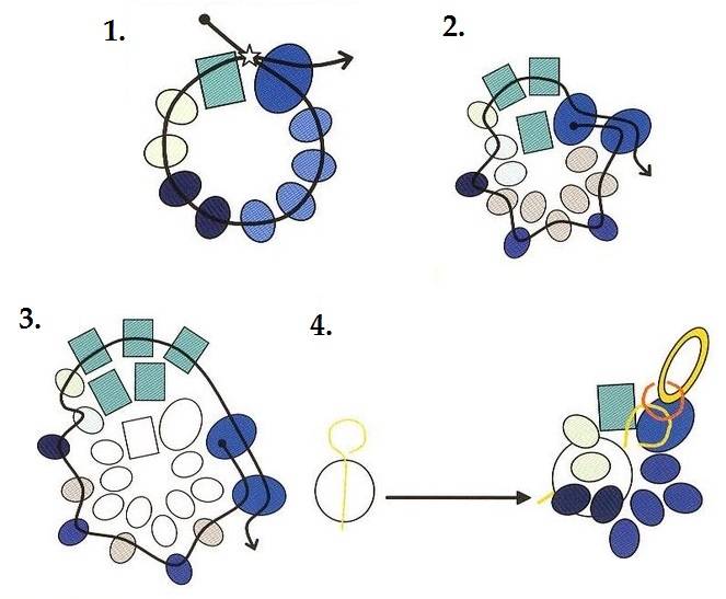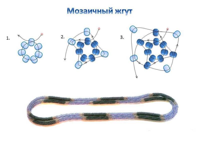Мозайка. Всеки кръг има нечетен брой мъниста, които се редуват в модела. Всеки нов ред се прикрепя към предишния.