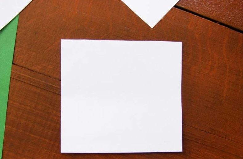 - Вземете лист хартия, сгънете го по диагонал, тъй като листът А4 е с правоъгълна форма, при сгъването ще остане правоъгълна линия в долната част, която спокойно можем да отрежем. Получаваме квадрат.