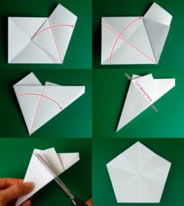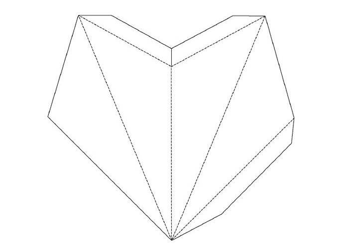 - След това в получените петоъгълници в центъра от всеки ъгъл начертайте линия на противоположната страна. Сега трябва да използвате ножица или нож за рязане на кутии, за да очертаете тези линии. Това трябва да се направи само по горния слой на картона, без да се реже докрай. Рисувайте от центъра към външните и вътрешните ъгли. Сгънете картона така, че краищата да минават по линията и нанесения с ножица връх. Базата е готова.