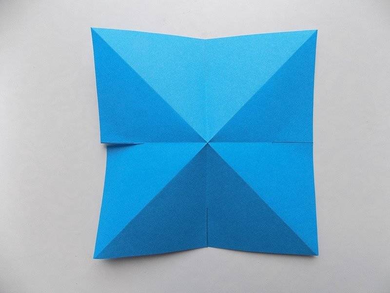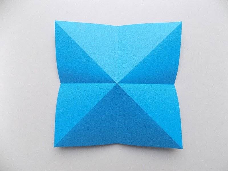 - Поставете квадрат пред себе си, като издърпате горния десен ъгъл към долния ляв. Получаваме триъгълник. Разгънете. След това издърпайте горния ляв край към долния десен и отново под прав ъгъл. Разгънете.