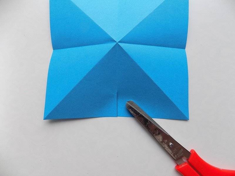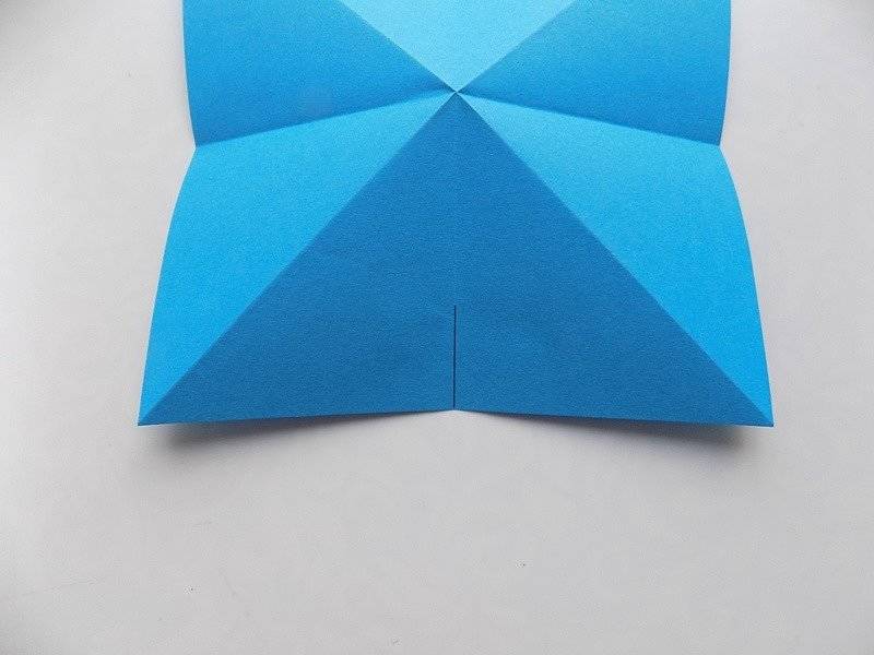 - Разгънете и с помощта на ножица направете четири прореза по линията на прегъване, по средата на центъра.