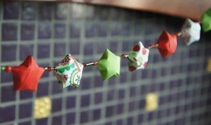 - Прекарайте панделка или конец през иглата и пробийте лъчите (все едно са събрани на един конец), за да се получи дълга змия. Можете да завържете възел след всяка звезда. Това предотвратява натрупването и събирането на нишките и позволява всяка от тях да виси на мястото си. Такива дълги гирлянди могат лесно да се съхраняват в малки кутии или просто в чанти. И си вземете, когато имате нужда, за всеки празничен повод.